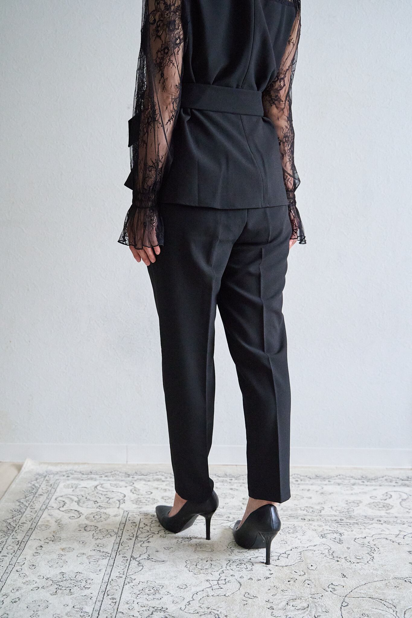 トップスとパンツのバランス感がスタイリッシュなシルエットを演出。