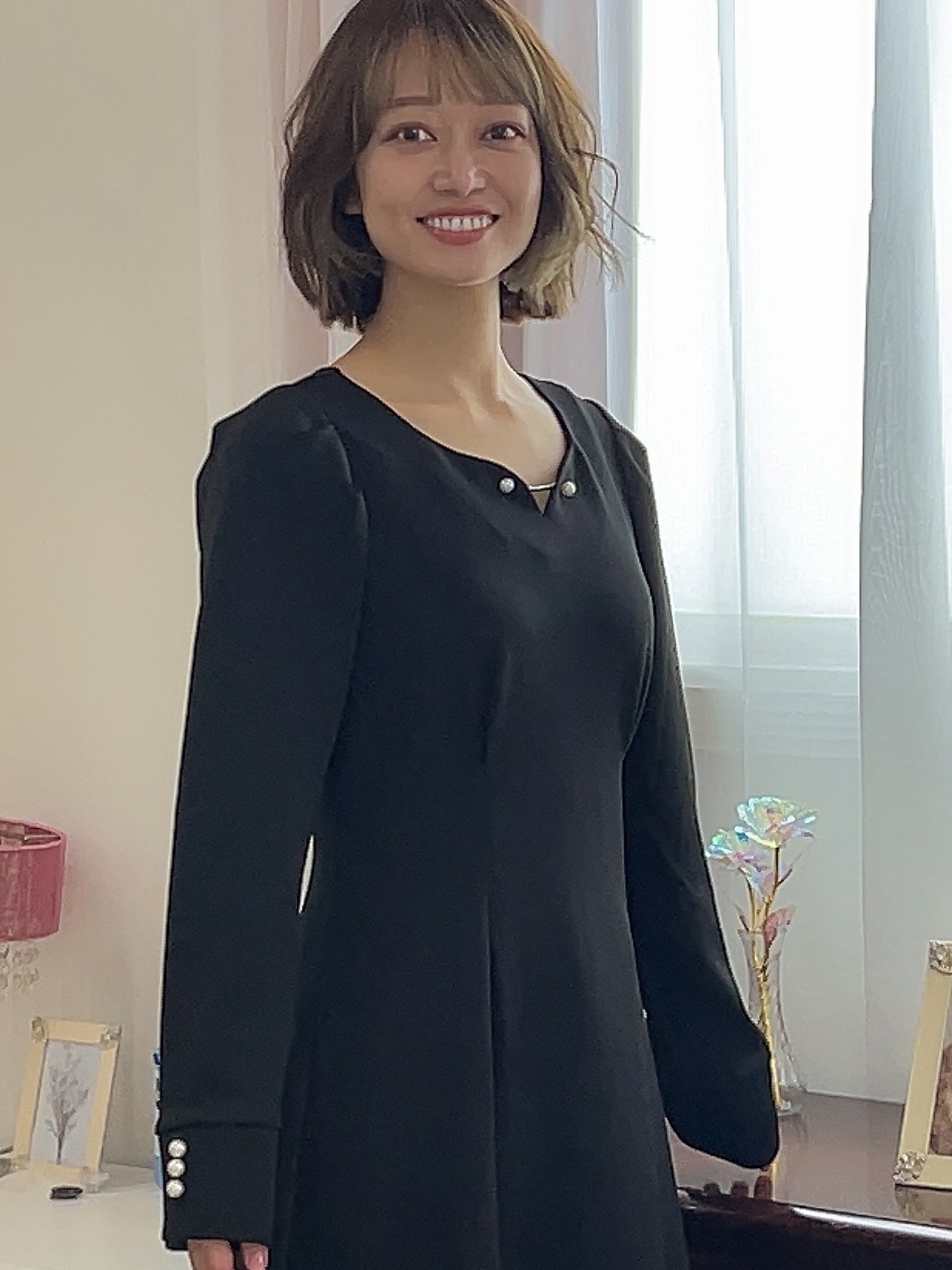 お袖と胸元のパールがシンプルながらも上品さを演出してくれる1枚。